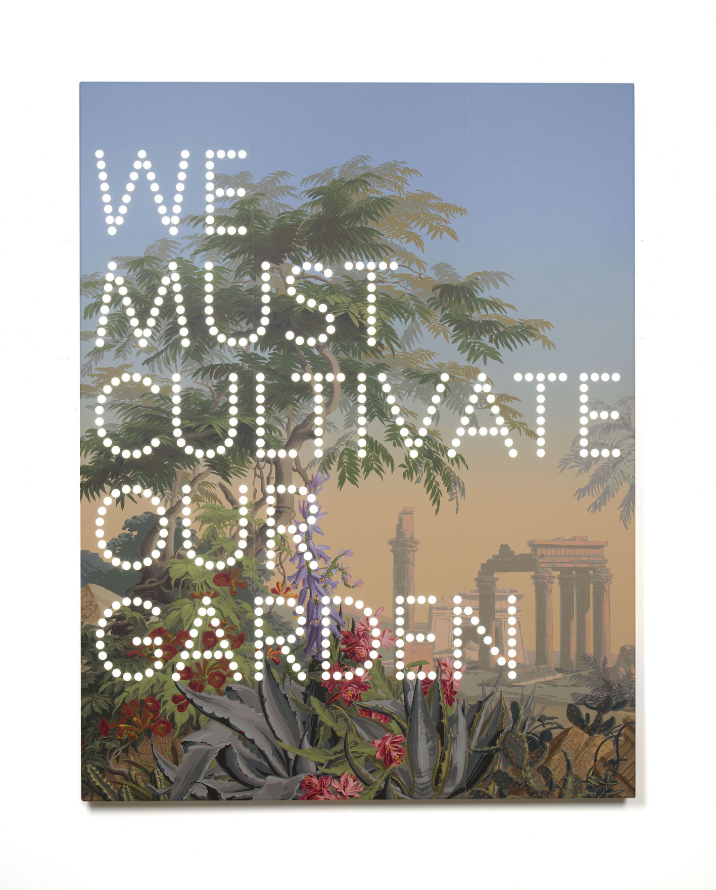 특히 런던 테이트 모던 가든에 설치되어 큰 주목을 받았던 <We Must Cultivate Our Garden>(2006)은 이번 전시에서 라이트 박스 버전으로 소개된다. 익숙한 문장이 지닌 울림은 공간의 빛과 결합하며 새로운 층위로 재배치된다.