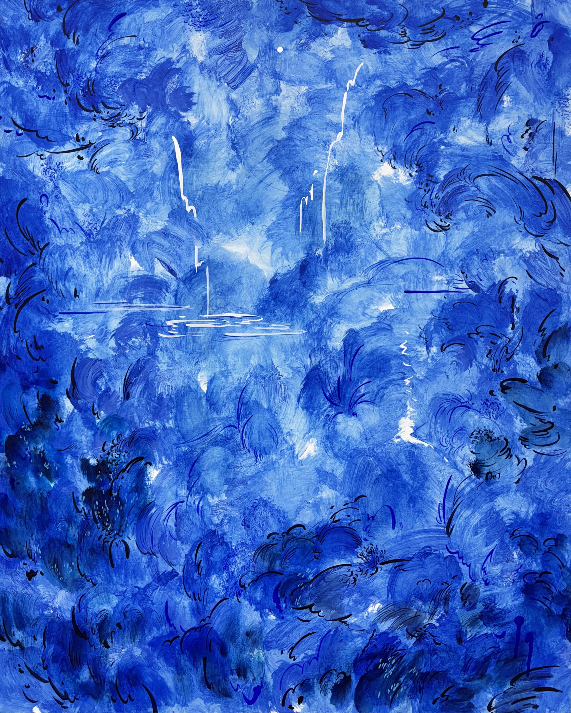 화면은 위쪽 중앙에 조금 더 밝은 톤을, 아래쪽 앞 공간에는 둥글게 어두운 톤을 배치해, 어두운 전경에서 살짝 밝은 안쪽을 바라보는 미묘한 거리감을 만든다. 푸른 붓 터치 사이에 숨겨진 선묘는 부드러우면서도 격정적인 움직임을 만들고, 하얗고 길게 미끄러지는 선들은 중력과 물줄기가 동시에 느껴지는 심연의 풍경을 떠올리게 한다. 조용하지만 끊어지지 않는 물소리가 들리는 듯한 화면이다.