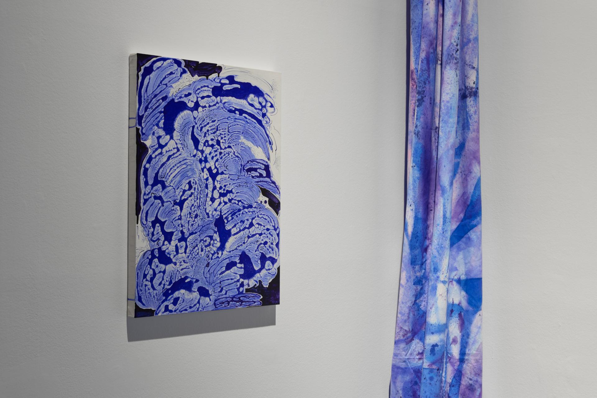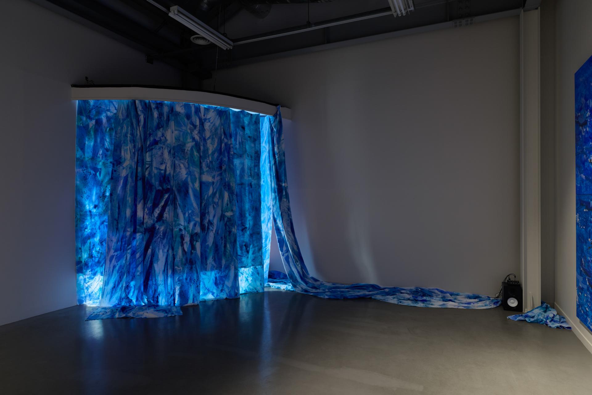 〈불맞춤〉은 주로 설치 형식으로 구성되며, 떨어져 있는 공간들을 하나의 회화적 장 속으로 끌어들인다. 공기, 빛, 바람 같은 요소가 천 위에 드리워진 색과 얽히며, 전시장은 잠정적인 ‘수면 아래’로 변한다. 뉴욕 개인전 제목이었던 〈Soundings of Blue〉, 그리고 이번 전시 제목 사이에는 ‘깊이를 재는 행위’라는 공통 관심사가 놓여 있다. 수심을 재는 사운딩 행위, 기준점에서 아래로의 거리를 표시하는 행위, 그리고 그 아래에 있을 무언가와 연결되고 싶어 하는 욕망까지 모두 “링크됨”이라는 태도로 묶인다.