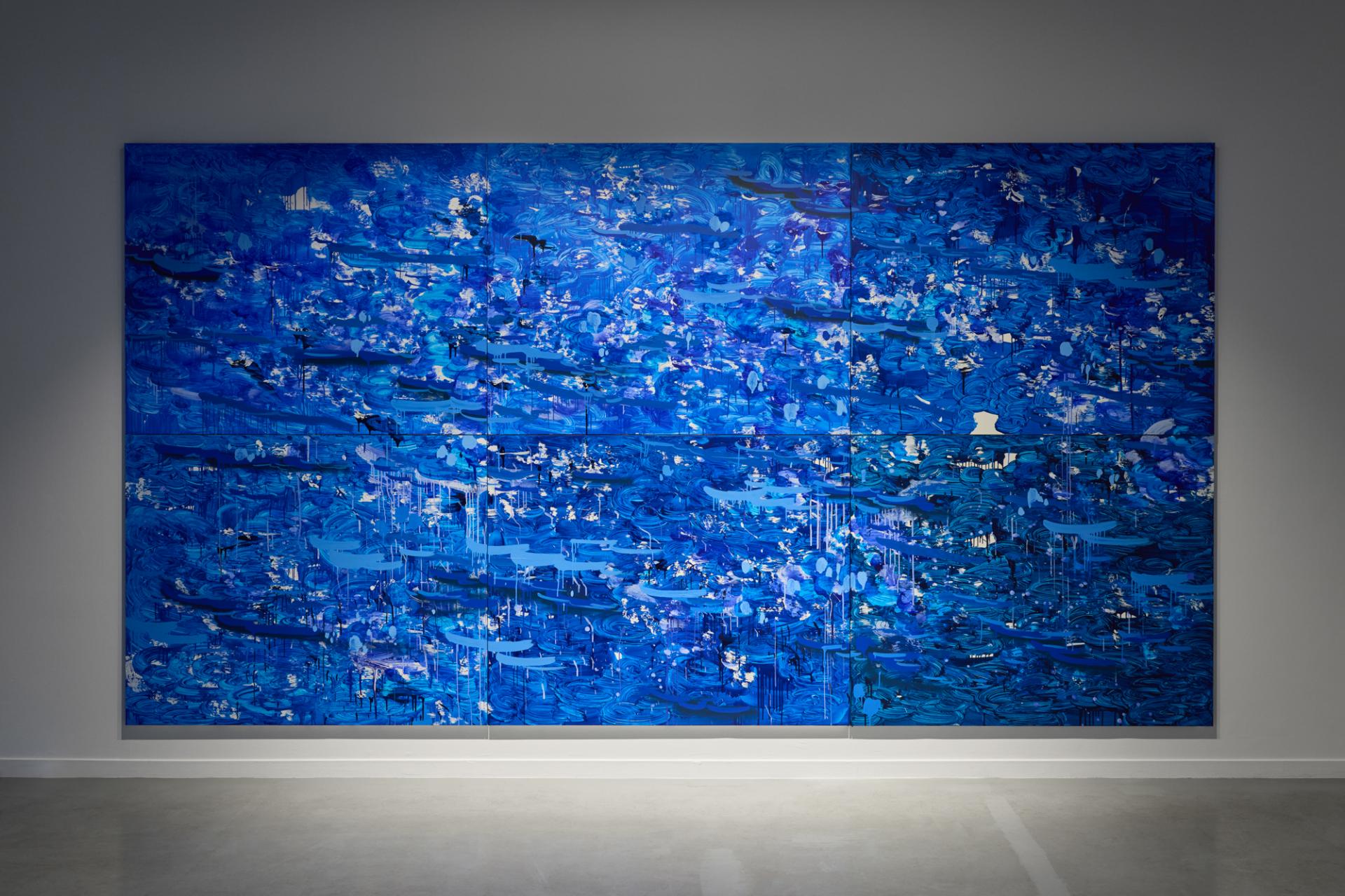 여기에 코발트, 울트라마린, 프러시안, 인디고 등 서로 다른 7~8가지 블루가 겹쳐진다. 색채는 단순한 바다의 묘사를 넘어서, 직관과 감정, 몸의 감각을 불러내는 매개로 작동한다. 수면의 경계에서 만나는 공기의 움직임, 깊은 물속 어딘가로 가라앉는 감각, 젖어 있으면서도 젖었음을 인식하지 못하는 신체의 상태 같은 것들이 이 블루 톤 안에서 미세하게 진동한다. 작가가 말하는 “깊은 집중의 상태, 무중력 같은 상태”가 바로 이 색을 통해 구현된다.