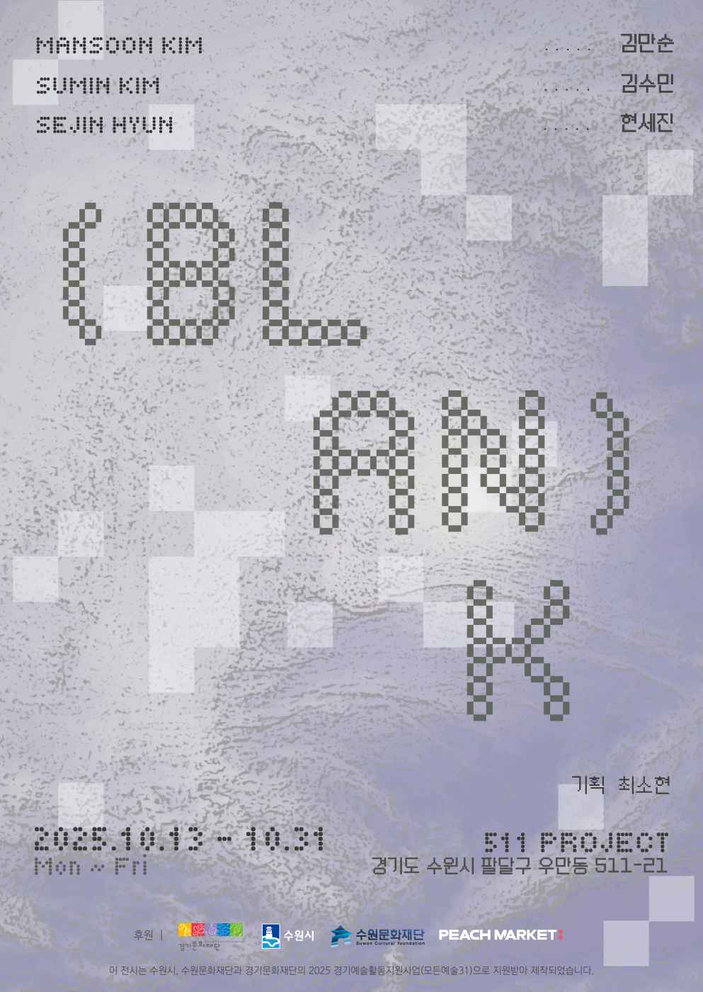 전시 《Blank》가 10월 13일부터 31일까지 511프로젝트에서 열린다. 이번 전시는 경기문화재단, 수원시, 수원문화재단, 피치마켓의 후원으로 진행되며, 작가 현세진, 김만순, 김수민이 참여한다. 언어, 이미지, 사물이라는 세 가지 매체를 통해 ‘부재’와 ‘공백’의 개념을 다루며, 의미와 형상이 사라지는 자리에서 드러나는 새로운 감각을 탐색한다.