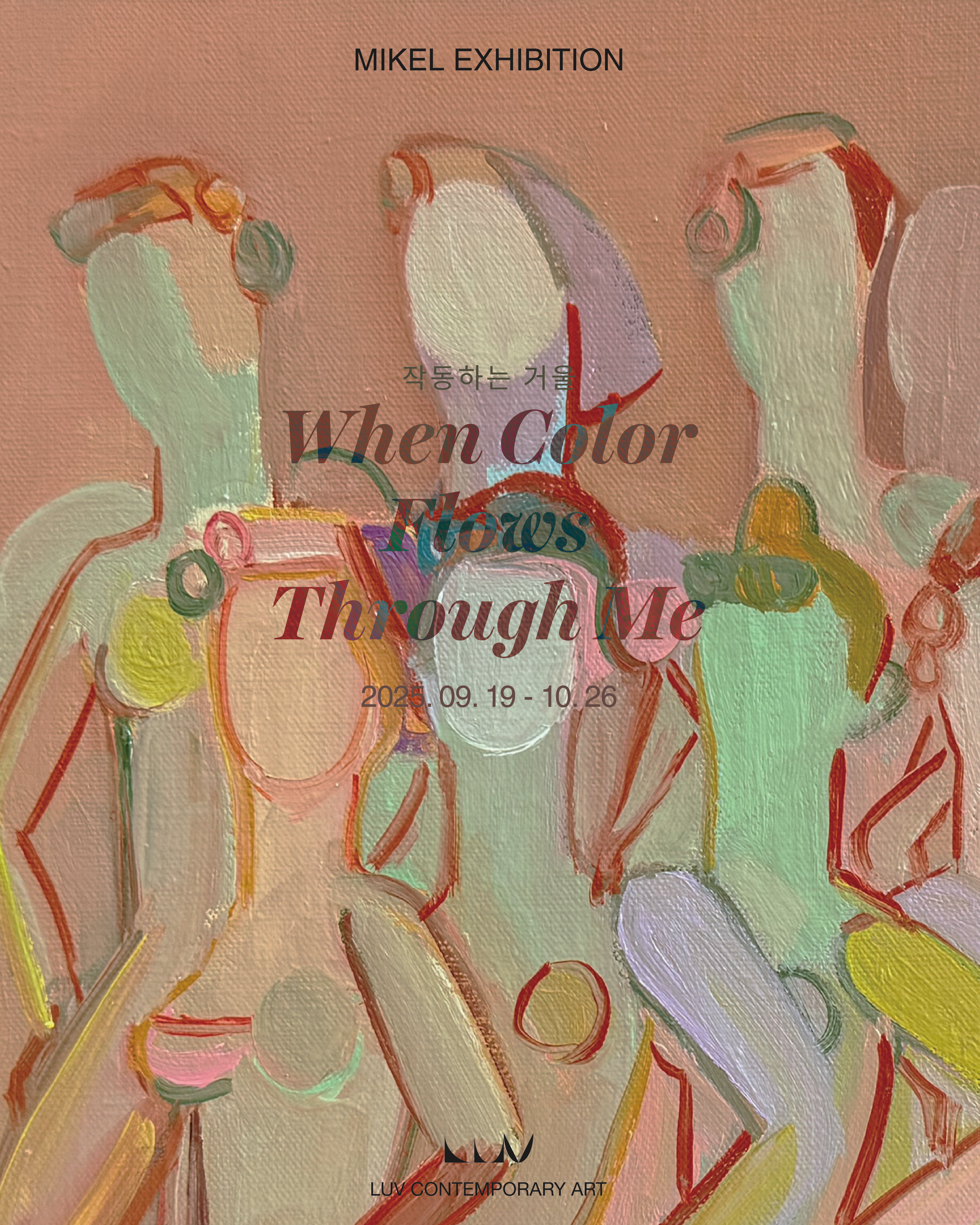 러브컨템포러리아트가 2025년 9월 19일(금)부터 10월 26일(일)까지 미켈 작가의 아홉 번째 개인전 〈When Color Flows Through Me : 작동하는 거울〉을 선보인다. 이번 전시는 ‘던져진 사람들’ 연작의 여섯 번째 시리즈로, 표정을 덜어내고 감정을 최소화한 인물들을 통해 색과 조형성에 집중한 신작을 소개한다.